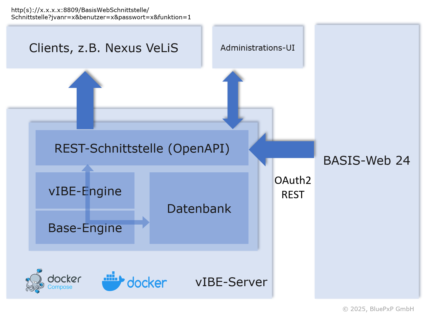 vIBE läuft auf einer (virtuellen) Linux-Maschine mit docker-compose und cacht alle relevanten Daten aus BASIS-Web in einer lokalen (in-memory) Datenbank. Die Klienten greifen über die originalen V1 Funktionsrufe zu
